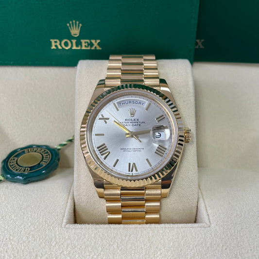 2022 Rolex Day-Date 40 18K Yellow Gold Silver Roman Dial Presidential Bracelet 228238