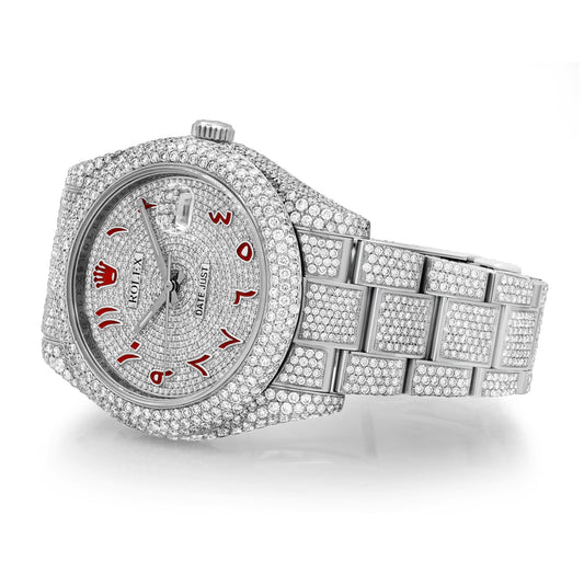 Rolex Datejust 41 IcedOut Custom Aftermarket Diamond-Set Stainless Steel Red Arabic Diamond Dial Oyster Bracelet Diamond Bezel 126300