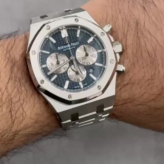 The 2017 Audemars Piguet Royal Oak Selfwinding Chronograph 41mm in stainless steel features a striking blue dial that exemplifies the brand’s signature blend of sportiness and sophistication. Powered by a precise automatic chronograph movement, this timepiece offers reliable performance and functionality. Its iconic octagonal bezel with exposed screws and integrated bracelet highlight the Royal Oak’s distinctive design heritage. Ideal for collectors and connoisseurs, this model balances technical excellence with timeless style.